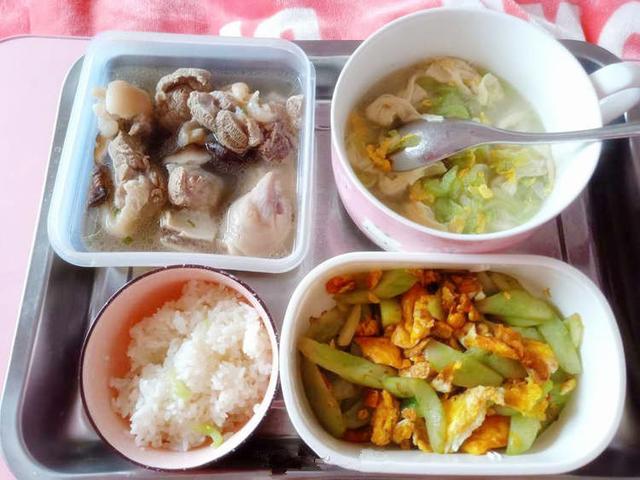 老家有小菜园 , 自然是有地方养鸡的 , 为了这个月子 , 她婆婆提前养好了二十只鸡 , 母的留着生蛋 , 公的留着炖汤 , 这不 , 这里面的月子餐就有炖公鸡 , 旁边的是爬藤丝瓜炖干豆皮子 , 从园子里拔一颗莴笋 , 叶子留着做汤 , 身子用来配鸡蛋炒 , 一个字 , 香!?